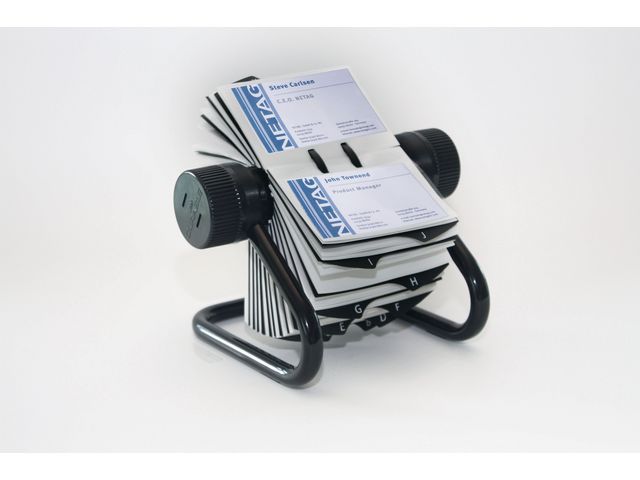 Få orden på visittkortene dine med praktiske og stilige løsninger som passer dine behov Praktisk rullekartotekløsning gir deg muligheten til å oppbevare opptil 200 visittkort i avtakbare plastlommer (104 x 72 mm), med 25 flyttbare registerfaner A-Å for enkel organisering. Rullekartoteket har en myk rotasjon og låsefunksjon for ønsket posisjon. Laget av høyglanset metallrør med gummiføtter for stabilitet og skånsomhet mot underlaget. Med mål på 19,5 x 13,5 x 17 cm (BxHxD) passer dette stativet perfekt på ethvert skrivebord eller kontor.