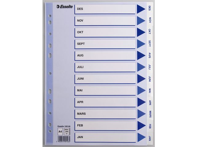 Esselte®-skillearket har et hvitt indeksark for hurtigreferanse og kant med faner, og er enkelt å plassere mellom sidene i et arkiv. Esselte®-skillearket kommer i A4-format og har blå faner som gjør at du kan holde oversikten over oppføringer eller månedsrapporter, raskt og enkelt. Det har også hvit indeks og blå trykk på fanene for å gjøre det lettere å lese. Skillearket er laget av slitesterk polypropylen. De forsterkede plastkantene beskytter kvaliteten på skillearket ved overdreven bruk.