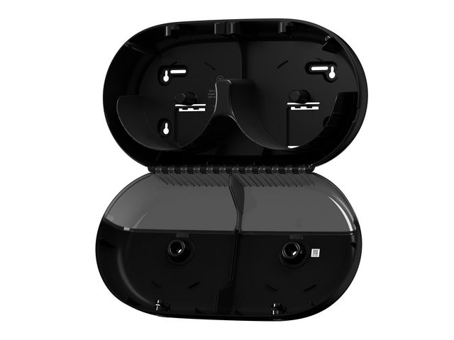 Tork SmartOne Twin Mini Toalettrull Dispenser i Elevation Design er et effektivt og svært robust dispensersystem som passer for krevende toalettrom med høy trafikk. På grunn av plass til to ruller og at den avgir ett tørk av gangen reduseres forbruket med opptil 40 % sammenlignet med tradisjonelle jumborulldispensere, noe som igjen betyr flere besøk per rull.