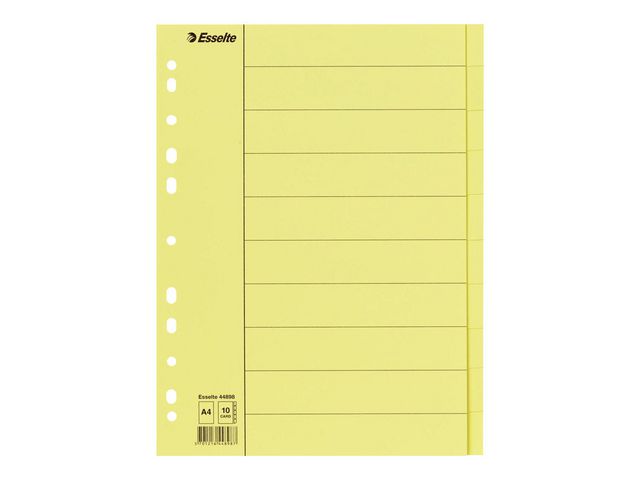 Esselte®-skilleark gjør organisering og merking enkelt, med 11 hull for å passe inn i ringpermer og notatbøker. Hver av etikettene er formatert slik at de kan skrives ut på med standard A4-størrelse som en mal. Esselte-etikettene er utviklet for å ha en universell størrelse med perforerte hull for å passe til en rekke ringperm- og notatbokstørrelser.