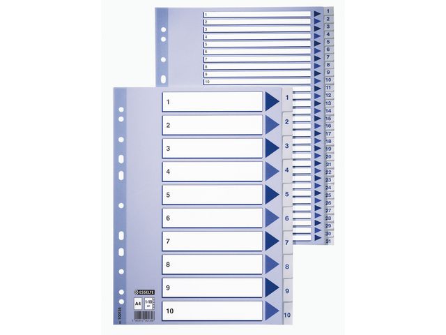 Disse forhåndstrykte skillearkene fra Esselte® er merket med tall, noe som gjør det enkelt å finne spesifikke dokumenter. Systematiser papirer og dokumenter enklere med Esselte® forhåndstrykte skilleark. De er laget av polypropylen og er ideelle for langvarig bruk. De er merket med tall, slik at du enkelt kan organisere papirene dine. Disse skillearkene har universalhull, slik at du kan bruke dem i de fleste permsystemene og enkelt omorganisere dokumentene dine.
