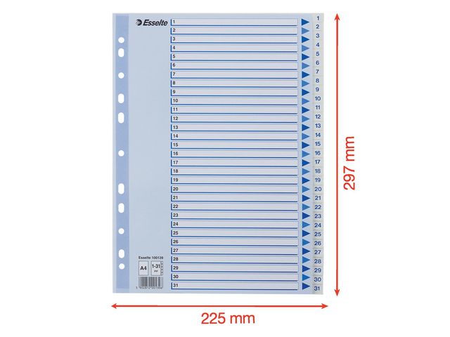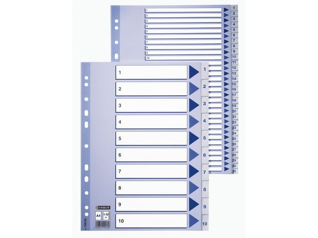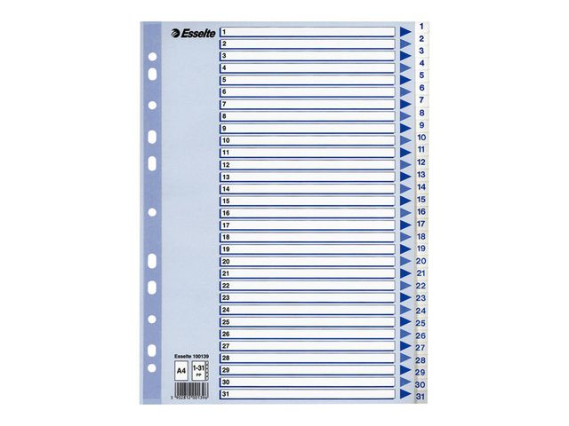 Esselte®-skilleark er utformet for effektiv organisering og arkivering av notatbøker, ringpermer og dokumenter. Esselte®-skillearkene er en ideell løsning for å administrere dine dokumenter og ringpermer. Skillearkene leveres forhåndstrykte for enkel merking og identifisering av ditt personlige eller arbeidsrelaterte innhold. Skillearkene er enkle å skrive på og passer også inn i alle ringpermer eller mapper ved å lage hull på sidene.