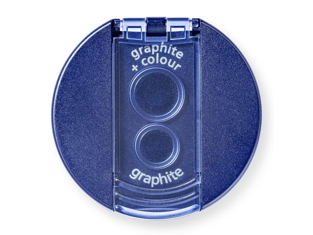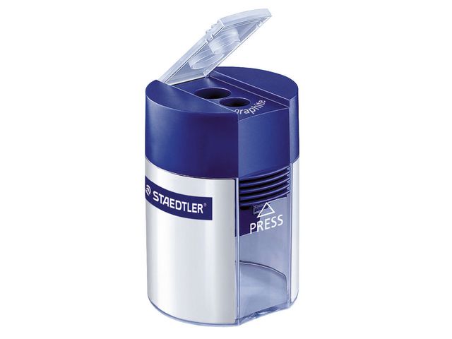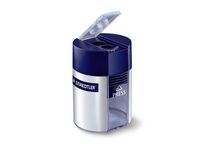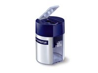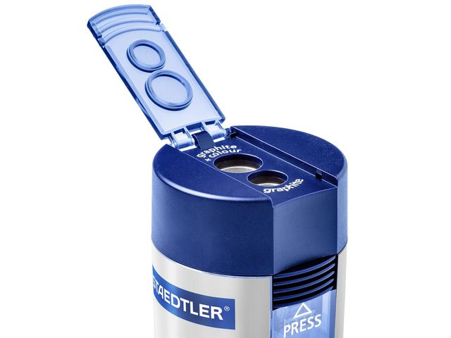 STAEDTLER 512 dobbel blyantspisser har to hull for blyanter av ulik størrelse. Denne blyantspisseren har et hengslet lokk for hullene som sikrer at spisserester ikke faller ut. Lokket har en sikkerhetslås som gjør det mulig å frakte blyantspisseren uten at spisserester faller ut. STAEDTLER 512 dobbel blyantspisser passer til blyanter av mange størrelser. Blyantspisseren har to hull av ulike størrelser som gjør det enkelt å spisse både små og store blyanter. Det lille hullet passer til blyanter av vanlig størrelse. Dette hullet har en spissere spissevinkel som gir tynne, nøyaktige streker. Det store hullet passer til tykke blyanter og fargeblyanter og gjør det lettere å lage myke, tykke linjer.