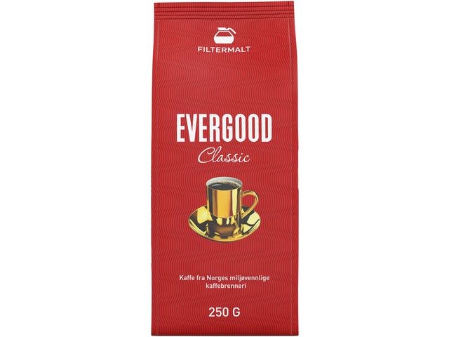EVERGOOD Kaffe består av 100% Arabica-bønner fra Colombia, Kenya, Costa Rica, Brasil og Guatemala. I frodige fjellområder høyt over havet, finnes det unike klimaet som modner kaffeplantens bønner langsomt. Slik får den fyldige, aromatiske smaksrikdommen som kjennetegner EVERGOOD Kaffe tid til å utvikle seg. EVERGOOD blir produsert på Norges miljøvennlige kaffebrenneri som åpnet i 2020. Brenneriet er hovedsakelig bygget i tre, og drives med 100 % fornybar energi. Du kan lese mer om Norges miljøvennlige kaffebrenneri på www.evergood.no.