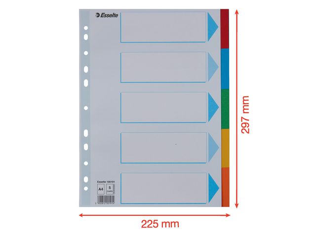 Disse blanke Esselte®-skillearkene har forsterkede hull som forebygger slitasje fra ringene i permen din. Bruk disse blanke Esselte®-skillearkene til rask og enkel organisering. Disse skillearkene er laget av papp og leveres i assorterte farger, slik at du raskt kan finne tilbake til bestemte emner i notatene dine. Skillearkene har forsterkede hull som minsker sjansen for at de rives opp av ringene i permen din. De har universalhull som dem kompatible med alle typer permer. Disse skillearkene er laget av resirkulerte materialer som er et miljøvennlig alternativ på kontoret.