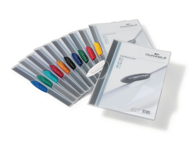 Stilren klemmappe i kraftig transparent PP-plast med farget klemme Mappen passer utmerket for oppbevaring av presentasjoner, tilbud og dokumenter