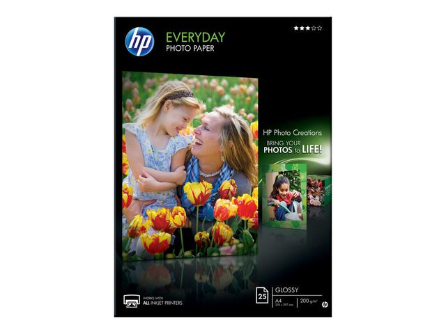 HP Everyday-fotopapir gir fargerike fotoprosjekter til en lav pris. Dette resirkulerbare, glansede papiret tørker raskt og kan brukes på hvilken som helst blekkskriver. Bruk HP Photo Creations-programvaren til å lage kalendere, fotokuber og annet.