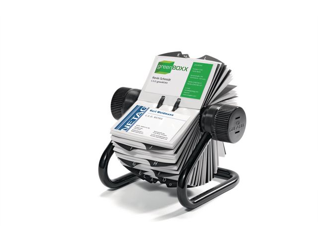 Få orden på visittkortene dine med praktiske og stilige løsninger som passer dine behov Praktisk rullekartotekløsning gir deg muligheten til å oppbevare opptil 200 visittkort i avtakbare plastlommer (104 x 72 mm), med 25 flyttbare registerfaner A-Å for enkel organisering. Rullekartoteket har en myk rotasjon og låsefunksjon for ønsket posisjon. Laget av høyglanset metallrør med gummiføtter for stabilitet og skånsomhet mot underlaget. Med mål på 19,5 x 13,5 x 17 cm (BxHxD) passer dette stativet perfekt på ethvert skrivebord eller kontor.