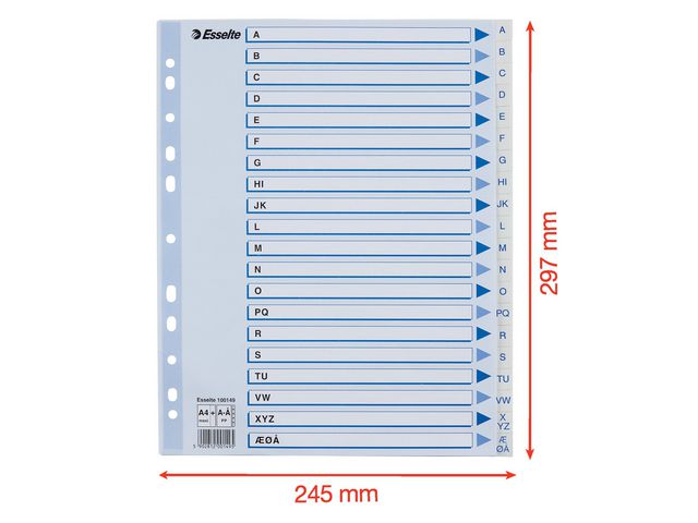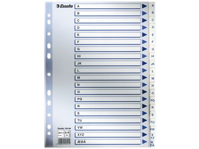 Esselte® forhåndstrykte skilleark har forsterkede hull, noe som gir ekstra beskyttelse mot daglig slitasje fra hyppig bruk. Systematiser papirer og dokumenter enklere med Esselte® forhåndstrykte skilleark. De er laget av polypropylen og er ideelle for langvarig bruk. De har universalhull, slik at du kan plassere dem i mange mapper når du skal organisere notatene dine. Disse skillearkene er ideelle for sortering av kunde- eller studentdokumenter og er merket i alfabetisk rekkefølge, slik at du enkelt kan finne viktig informasjon. Disse skillearkene har forsterkede hull, noe som gjør at det blir mindre sjanse for at de rives og faller ut av permen.