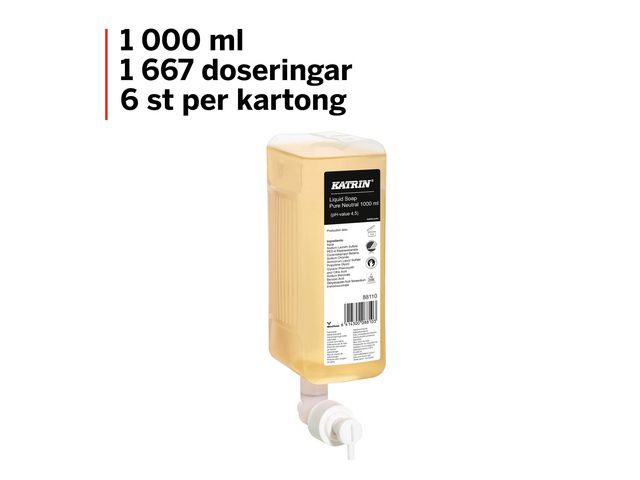 Effektiv og mild flytende såpe uten farge og parfyme. En kremet såpe som etterlater hendene myke og fuktige. Katrin Clean er en effektiv, nøytral og mild flytende såpe uten farge og parfyme og gir en luksuriøs følelse av rene og fuktede hender. Mild, behagelig såpe som er skånsom mot både hud og miljø. Såpen har hudvennlig PH-verdi og er skånsom mot huden. Produktet er pakket i en resirkulerbar beholder og inneholder milde ingredienser for sensitiv hud for hyppig bruk. Passer til: Katrins såpedispenser 1000ml pH-verdi: 4.5 Flytende Høy kapasitet Fuktighetsgivende Felles og hygienisk forsegling for patron og pumpe 1667 doseringer per patron Godkjenninger: ISO9001, ISO14007 Duft: Uparfymert Farge: Klar Kapasitet: 1 liter