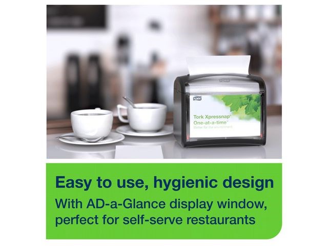 Kontroller kostnadene knyttet til serviettforbruk, og forbedre hygienenivået med Tork Xpressnap serviettdispenser. Du kan også ta med din egen logo eller reklame ved hjelp av Ad-a-Glance-funksjonen fra Tork. Denne bærbare Tork Xpressnap serviettdispenseren sikrer mindre serviettavfall og gir bedre hygiene. Bare én serviett slippes av gangen, noe som gir lavest mulige kostnader. Torks Ad-a-Glance-funksjon gir deg muligheten til å reklamere eller informere kunden ved hjelp av ferdige maler eller egen design. Dispenseren er laget av plast, og den bærbare størrelsen gjør at den kan brukes i hektiske miljøer som kafeer, hurtigmatrestauranter og take-away-bedrifter. Reduser vedlikeholdskostnadene og få mer tid til andre oppgaver med denne holdbare serviettdispenseren som er enkel å rengjøre.
