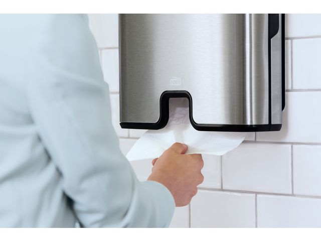 Spar plass samtidig som du fremmer følelsen av eleganse. Denne dispenseren har rette linjer, glatte overflater og beskyttelse mot fingeravtrykk, noe som gjør at denne ser bra ut til enhver tid. Ved fylle dispenseren med et premium tørkepapir vil man kunne tilby gjestene en god opplevelse. Med dispensering av et og et ark av gangen kan man redusere forbruket og sikre optimal hygiene. Enkel å fylle på, og det praktiske inspeksjonsvinduet sørger for man kan følge med på forbruket.