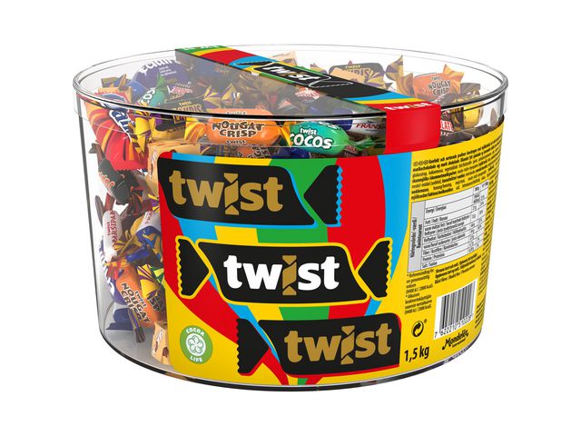 Freia Twist, en boks med biter av sjokolade og karameller trukket i lys- eller mørk sjokolade. Enten det er CoCos, banan, lakris eller Daim så har alle sin favoritt! Derfor gjelder det å verne om sin favorittbit.