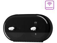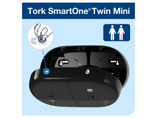 Tork SmartOne Twin Mini Toalettrull Dispenser i Elevation Design er et effektivt og svært robust dispensersystem som passer for krevende toalettrom med høy trafikk. På grunn av plass til to ruller og at den avgir ett tørk av gangen reduseres forbruket med opptil 40 % sammenlignet med tradisjonelle jumborulldispensere, noe som igjen betyr flere besøk per rull.