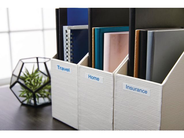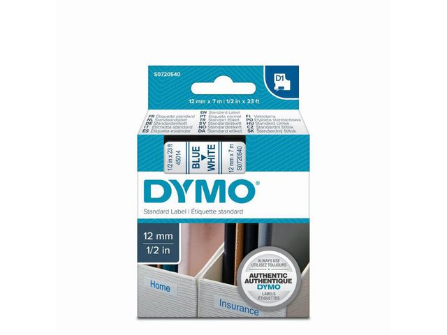 - innendørs eller utendørs, på kontoret, verkstedet, butikken eller hvor som helst. DYMO® D1-etikettkassetten på 12 mm gir stilige, tilpassede etiketter i blått og hvitt. Velegnet både for innendørs og utendørs bruk. D1-teipene viser tekst som skrives ut ved hjelp av varmeoverføringsteknologi, noe som fjerner behovet for blekk og toner. Hver etikett er slitesterk og varig siden de er vannbestandige, UV-bestandige og temperaturbestandige mellom -18 grader og 90 grader. De kleber på nesten alle jevne og rene overflater, inkludert plast, papir, metall, tre og glass. Den selvklebende polyesterteipen kan også fjernes for korttidsmerking uten å legge igjen limrester.