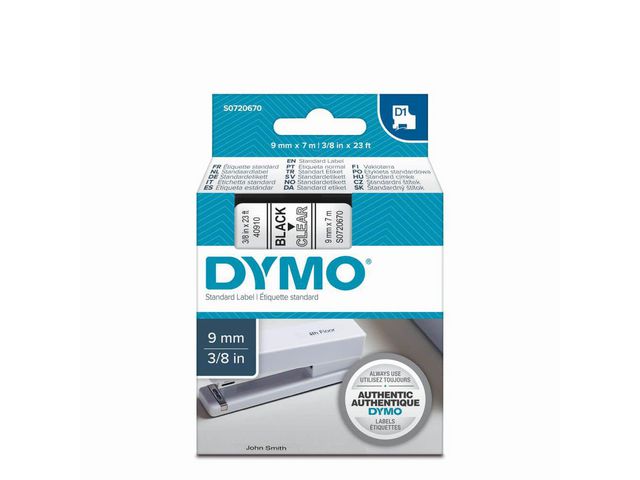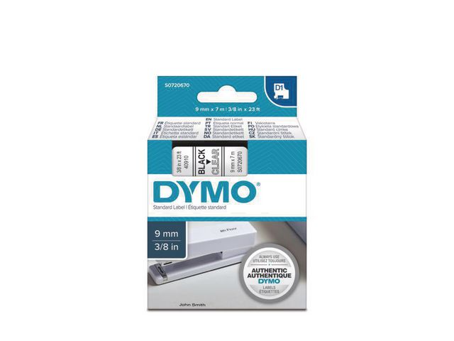 - innendørs eller utendørs, på kontoret, verkstedet, butikken eller hvor som helst. DYMO® D1-etikettkassetten på 9 mm gir stilige, tilpassede etiketter i sort på en gjennomsiktig bakgrunn som er raske og enkle å påføre. Velegnet både for innendørs og utendørs bruk. D1-teipene viser tekst som skrives ut ved hjelp av varmeoverføringsteknologi, noe som fjerner behovet for blekk og toner. Alle etiketter er slitesterke og varige siden de er vannbestandige, UV-bestandige og temperaturbestandige mellom -18 og 90 grader celsius. De kleber på nesten alle jevne og rene overflater, inkludert plast, papir, metall, tre og glass. Den selvklebende teipen kan også fjernes for korttidsmerking uten å etterlate limrester.
