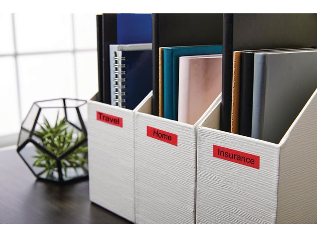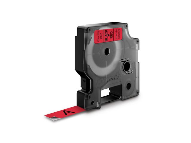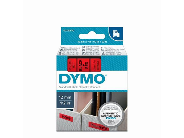 - innendørs eller utendørs, på kontoret, verkstedet, butikken eller hvor som helst. DYMO® D1-etikettkassetten på 12 mm gir stilige, tilpassede etiketter i sort og rødt. Velegnet både for innendørs og utendørs bruk. D1-teipene viser tekst som skrives ut ved hjelp av varmeoverføringsteknologi, noe som fjerner behovet for blekk og toner. Hver etikett er slitesterk og varig siden de er vannbestandige, UV-bestandige og temperaturbestandige mellom -18 grader og 90 grader. De kleber på nesten alle jevne og rene overflater, inkludert plast, papir, metall, tre og glass. Den selvklebende polyesterteipen kan også fjernes for korttidsmerking uten å legge igjen limrester.