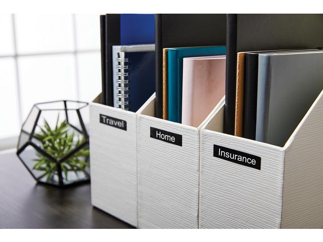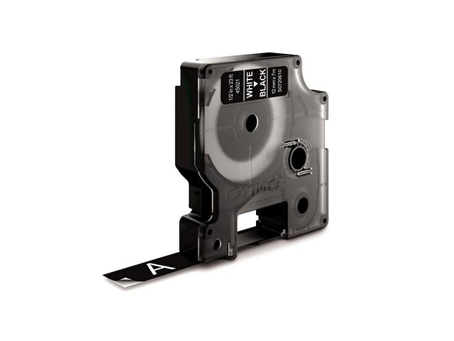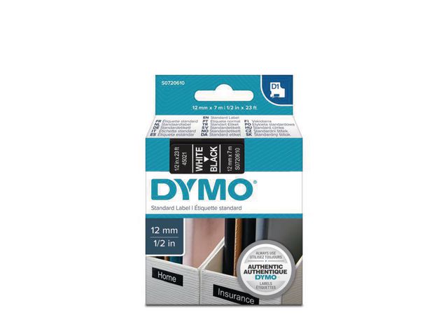 - innendørs eller utendørs, på kontoret, på verkstedet, i butikken eller hvilket som helst annen arbeidsplass. DYMO® D1-etikettkassetten på 12 mm gir stilige, tilpassede etiketter i hvitt på sort som er raske og enkle å påføre. Velegnet både for innendørs og utendørs bruk. D1-tapene viser tekst som skrives ut ved hjelp av varmeoverføringsteknologi, noe som fjerner behovet for blekk og toner. Alle etiketter er slitesterke og varige siden de er vannbestandige, UV-bestandige og temperaturbestandige mellom -18 og 90 grader celsius. De kleber på nesten alle jevne og rene overflater, inkludert plast, papir, metall, tre og glass. Den selvklebende teipen kan også fjernes for korttidsmerking uten å etterlate limrester.