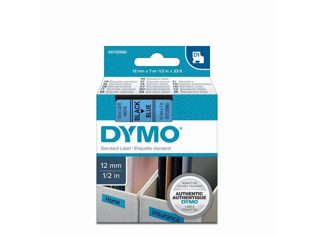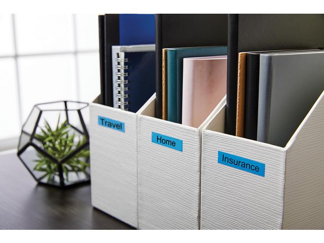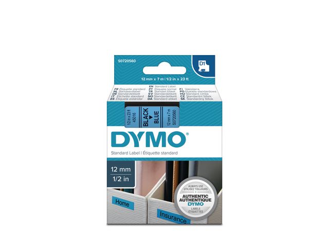 - innendørs eller utendørs, på kontoret, verkstedet, butikken eller hvor som helst. DYMO® D1-etikettkassetten på 12 mm gir stilige, tilpassede etiketter i sort og blått. Velegnet både for innendørs og utendørs bruk. D1-teipene viser tekst som skrives ut ved hjelp av varmeoverføringsteknologi, noe som fjerner behovet for blekk og toner. Hver etikett er slitesterk og varig siden de er vannbestandige, UV-bestandige og temperaturbestandige mellom -18 grader og 90 grader. De kleber på nesten alle jevne og rene overflater, inkludert plast, papir, metall, tre og glass. Den selvklebende polyesterteipen kan også fjernes for korttidsmerking uten å legge igjen limrester.