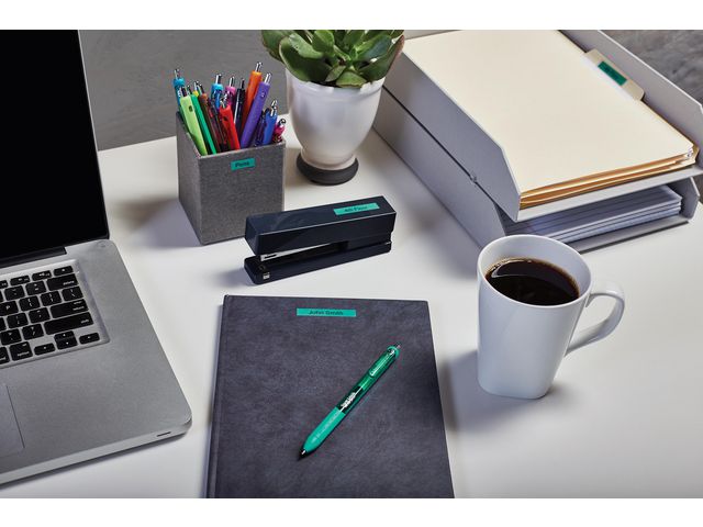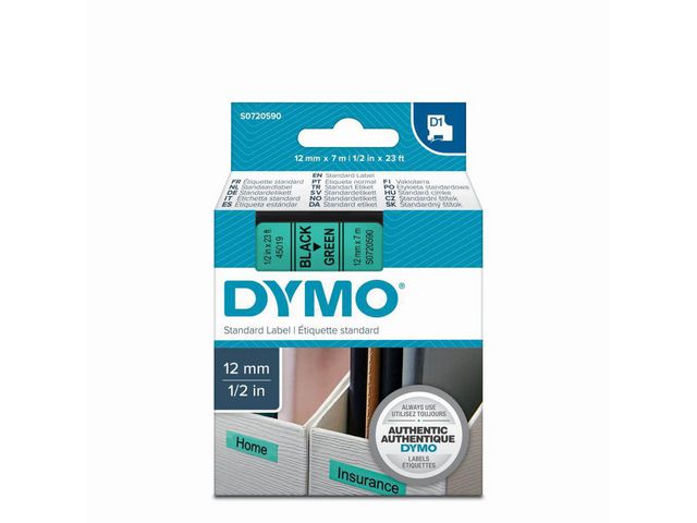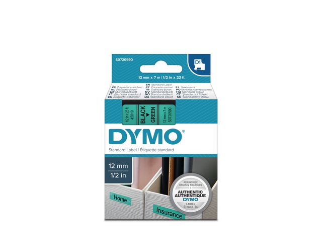 - innendørs eller utendørs, på kontoret, verkstedet, butikken eller hvor som helst. DYMO® D1-etikettkassetten på 12 mm gir stilige, tilpassede etiketter i sort og grønt. Velegnet både for innendørs og utendørs bruk. D1-teipene viser tekst som skrives ut ved hjelp av varmeoverføringsteknologi, noe som fjerner behovet for blekk og toner. Hver etikett er slitesterk og varig siden de er vannbestandige, UV-bestandige og temperaturbestandige mellom -18 grader og 90 grader. De kleber på nesten alle jevne og rene overflater, inkludert plast, papir, metall, tre og glass. Den selvklebende polyesterteipen kan også fjernes for korttidsmerking uten å legge igjen limrester.