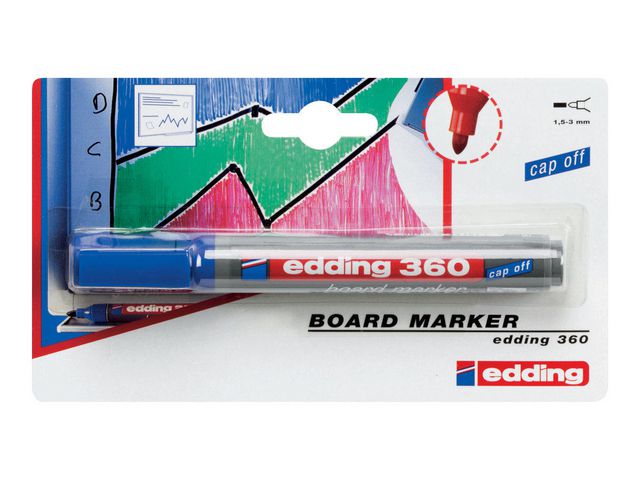 Edding 360-Whiteboardpenn bruker pigmentblekk med svak lukt og skriver jevnt på alle tusjtavler og andre ikke-porøse flater. Whiteboardpennen er spesialformet for å skrive på Whiteboard og så å si alle ikke-porøse overflater, f.eks. emalje, glass og melamin. Det hurtigtørkende og lysfaste blekket kan lett tørkes av uten fuktighet. Whiteboardpennen har et spesielt tørkebestandig blekk som ikke tørker ut selv om hetten er av i flere uker om gangen. Edding Retract 360-Whiteboardpenn har en middels tykk kulespiss med en strekbredde på 1,5-3 mm og passer utmerket til oppgaver som krever større presisjon og nøyaktighet. Whiteboardpennen har en lett utførelse som gjør den svært behagelig og enkel å bruke. Den leveres med hette og lommeklips, slik at det er lett å ta den med seg på farten. Videre kan produktet etterfylles og er dermed et økologisk alternativ.