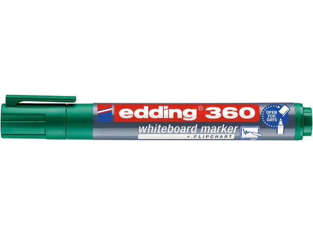 Edding 360-Whiteboardpenn bruker pigmentblekk med svak lukt og skriver jevnt på alle tusjtavler og andre ikke-porøse flater. Whiteboardpennen er spesialformet for å skrive på Whiteboard og så å si alle ikke-porøse overflater, f.eks. emalje, glass og melamin. Det hurtigtørkende og lysfaste blekket kan lett tørkes av uten fuktighet. Whiteboardpennen har et spesielt tørkebestandig blekk som ikke tørker ut selv om hetten er av i flere uker om gangen. Edding Retract 360-Whiteboardpenn har en middels tykk kulespiss med en strekbredde på 1,5-3 mm og passer utmerket til oppgaver som krever større presisjon og nøyaktighet. Whiteboardpennen har en lett utførelse som gjør den svært behagelig og enkel å bruke. Den leveres med hette og lommeklips, slik at det er lett å ta den med seg på farten. Videre kan produktet etterfylles og er dermed et økologisk alternativ.