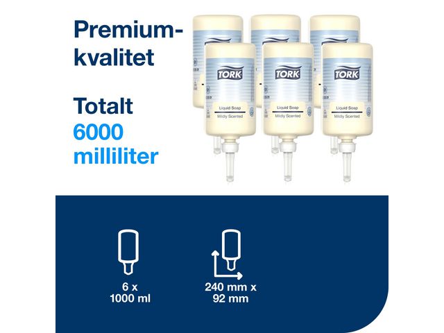 Den parfymerte flytende håndsåpen Tork Premium S1 gir maksimal komfort og hygiene, er dermatologisk testet og mild mot huden. Den lett parfymert flytende håndsåpen Tork Premium S1 er en svært mild håndsåpe, som er ideell til daglig bruk. Den er skånsom, men effektiv, og fremmer god hygiene. Den er uten parfyme, dermatologisk testet og spesielt utviklet for å dekke behovene til personer som må vaske hendene regelmessig, for eksempel restaurant- og sykehuspersonell, tannleger, frisører og lignende. I tillegg minimerer sammensetningen uten fargestoffer risikoen for irritasjon, og den kremete konsistensen roer ned og pleier huden. Den gjenvinnbare flasken med brukervennlig pumpemekanisme gjør dette til et kostnadseffektivt produkt. Tork Premium S1 flytende håndsåpe inneholder en mild perleingrediens som gir skinnende, luksuriøst utseende og følelse.