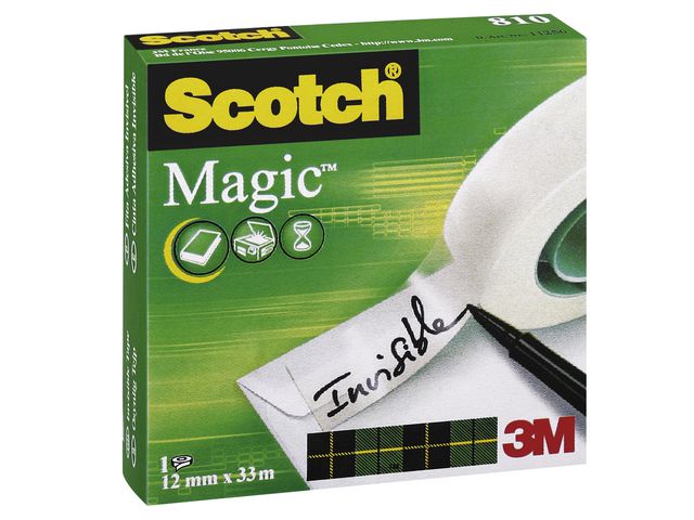 Med de mange bruksområdene som festemiddel og etikett er den usynlige Scotch® MagicT-teipen et populært valg for bruk hjemme og på kontoret. Scotch® MagicT-teipen er klar når den påføres og er et flott alternativ til lim når det gjelder å reparere papirrifter i bøker eller andre viktige papirprodukter. Den jevne og matte overflaten gjør at den også er lite synlig på fotokopier. Denne gjennomsiktige teipen av høy kvalitet kan brukes til å teipe papp, feste papir eller pakke inn små pakker. Den kan også brukes til merking, da den kan skrives på med penn, blyant eller merkepenn. Teipen er lett å kutte, rulle av og håndtere, og kan brukes til mange forskjellige formål hjemme, på skolen eller på arbeidsplassen. Ettersom teipen ikke tørker ut og eller blir gul over tid, beholder dokumentene dine også alltid det profesjonelle utseendet. Hver teiprull måler 12 mm x 33 m og leveres i en enkelt pakke.
