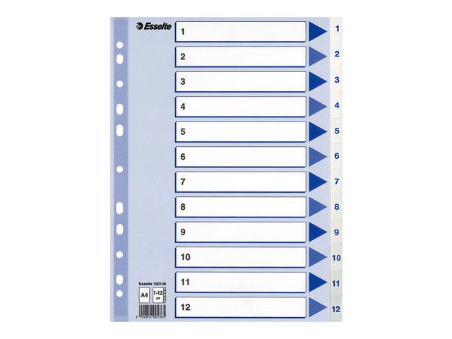 Esselte-skillearkfaner er det ideelle verktøyet for rask, enkel og tilpassbar organisering i notatbøker, ringpermer og mapper som inneholder A4-dokumenter og -papirer. Hver Esselte®-skillearkfane leveres nummerert for enkel organisering med farger og tall. Jopa-skillearkene er laget av polypropylenplast som kan skrives ut på for optimal tilpasning. De er et enkelt hjelpemiddel som studenter, lærere, helsepersonell og ledere kan bruke til å dele inn og kategorisere arbeidet deres. De slitesterke skillearkfanene leveres med 11 perforerte hull slik at de kan passe til et stort utvalg av ringperm- og notatbokstørrelser.