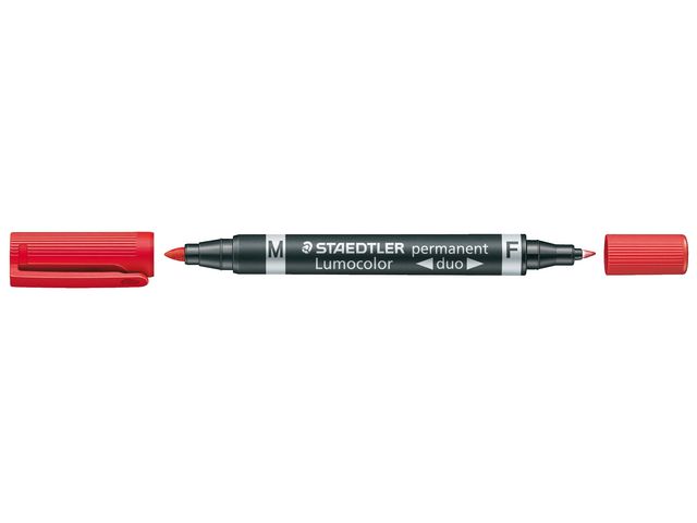 STAEDTLER Lumocolor® Duo permanent merkepenn har to spisser med forskjellig størrelse på én penn. Med denne permanente merkepennen kan du skrive på nesten alle typer overflater, inkludert glass, metall, plast, stoff og transparenter. STAEDTLER Lumocolor® Duo permanent merkepenn har to separate spisser på forskjellige sider av samme penn. Den har en tynn kulespiss som gir en strekbredde på ca. 0,6 mm. Dette gjør den ideell for arbeid som krever presisjon. På den andre enden har den en middels tykk spiss som lager en linje på 1,5 mm, som passer mer markant og fet skriftstil. Merkepennen har et spesielt blekk som er vannbestandig og ikke smitter av, slik at det tåler nesten alle slags forhold. Blekket tørker i løpet av sekunder, noe som gjør denne merkepennen til det perfekte valget for venstrehendte. Blekket inneholder heller ikke xylen eller toluen og avgir dermed mindre lukt enn det som er vanlig. Merkepennen har en hette og lommeklips som gjør den praktisk å bruke og lett å ta med seg. Videre er den påfyllbar og kan ligge uten hette i flere dager uten at blekket tørker.