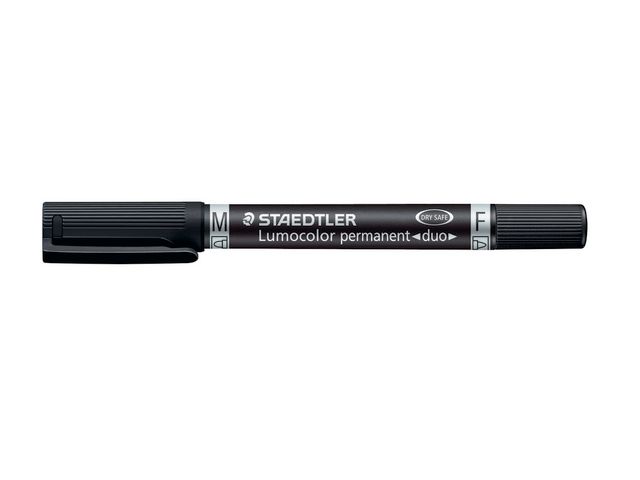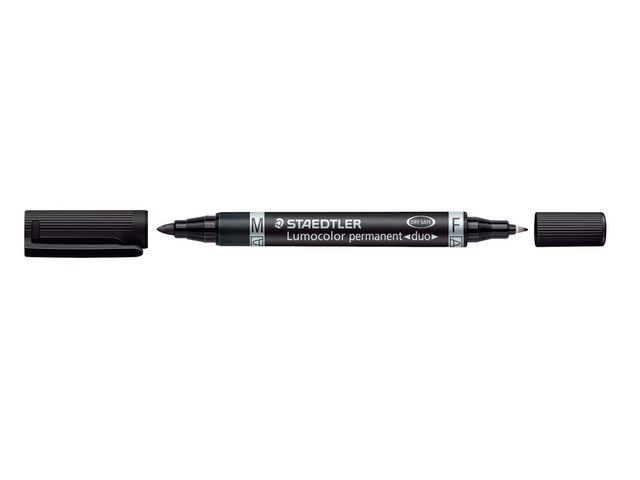 STAEDTLER® Lumocolor® Duo permanent merkepenn har to spisser med forskjellig størrelse på én penn. Med denne permanente merkepennen kan du skrive på nesten alle typer overflater, inkludert glass, metall, plast, stoff og transparenter. Merkepennen har to separate spisser på forskjellige sider, en tynn kulespiss som gir en strekbredde på 0,6mm pg en middels tykk spiss som lager en linje på 1,5mm. Dette gjør den ideel for arbeid som både krever presisjon og en markant og fet skriftstil. Blekket er vannbestandig og smitter ikke av, slik at det tåler nesten alle slags forhold. Det tørker i løpet av sekunder, noe som gjør denne merkepennen til det perfekte valget for venstrehendte. Blekket inneholder heller ikke xylen eller toluen og avgir dermed mindre lukt enn det som er vanlig. Merkepennen har en hette og lommeklips som gjør den praktisk å bruke og lett å ta med seg. Videre er den påfyllbar og kan ligge uten hette i flere dager uten at blekket tørker. Permanent merkepenn med to spisser Presisjon og nøyaktighet Kan brukes til å skrive på nesten alle typer overflater Vannbestandig og hurtigtørkende blekk Enkel å etterfylle Fin og mellomstor kulespiss Strekbredde: 0,6-1,5mm Farge: Sort