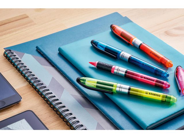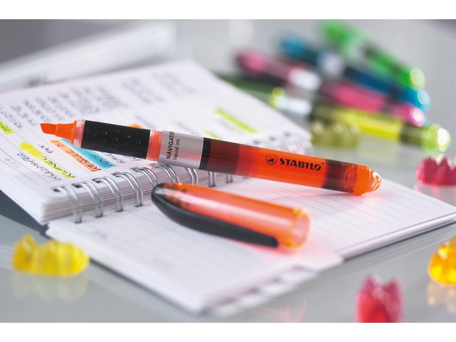 Merk og fremhev viktig informasjon med STABILO® NAVIGATOR®-merkepennen som har en slank, gjennomsiktig kropp og en praktisk klemme. Den stilige STABILO® NAVIGATOR®-merkepennen har en slank, gjennomsiktig kropp, som gjør at blekket er synlig, og du har kontroll på det. I tillegg har pennen en myk gripesone som gir komfort og kontroll under bruk. LUMINATOR® er ideell for daglig bruk av studenter og forretningsfolk som ofte flytter på seg. Den bruker et pålitelig vannbasert blekk med Anti-Dry-Out-teknologi som gjør at den kan ligge uten hette i 4 timer uten å tørke, og er egnet for nesten alle typer papir. Blekket vil bli fordelt jevnt helt ned til siste dråpe. Den har en robust skåskåret spiss som gir 2 strekbredder på 1 og 4 mm, slik at du kan bruke den til en rekke oppgaver som skriving, understreking eller fremheving. Hver merkepenn er tilgjengelig i en rekke attraktive fluoriserende farger, og har en hendig klips slik at du kan ta den med deg.