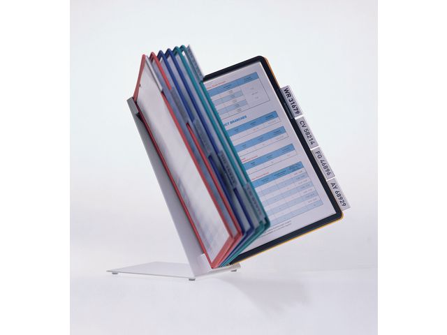 Bordstativet DURABLE VARIO® leveres med 10 paneler der du får plass til opptil 20 A4-ark for enklere lesing. Plasser dette presentasjonssystemet på pulten eller andre overflater der du har behov for å lese mens du har hendene frie. Hvert panel kan vise informasjon på begge sider og enkelt vendes opptil 90 grader. Det er enkelt å sette inn dokumenter i panelene i presentasjonsmappen. Panelene er laget av polypropylen, og basen er laget av slitesterkt metall. DURABLE-bordstativet er plassbesparende og har mange bruksområder, inkludert til produktinformasjon, prislister, presentasjoner og mye annet.