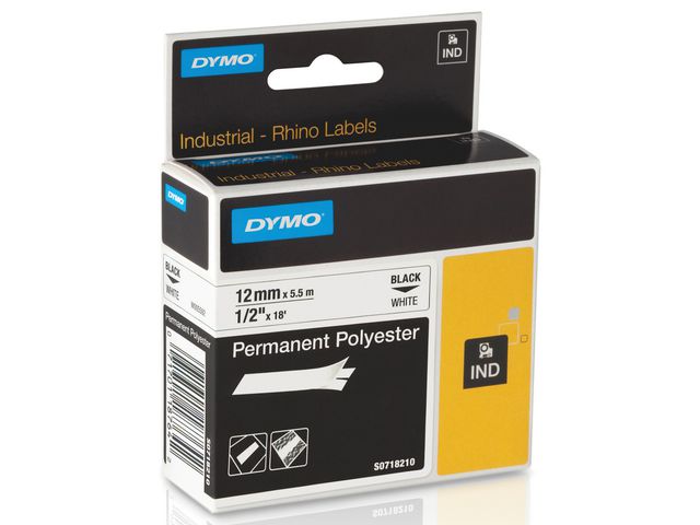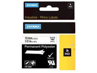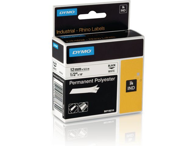 Den permanente DYMO® Rhino-polyesterkassetten på 12 mm inneholder kraftig polyesterteip i sort og hvitt. Gir robuste etiketter som varer lenge. Perfekt til bruk innendørs og utendørs for merking av beholdere, paneler, bjelker eller hyller. Rhino-etikettene viser tekst som skrives ut ved hjelp av varmeoverføringsteknologi, noe som fjerner behovet for blekk og toner. De er bestandige mot vann, UV-lys, kjemikalier og olje og har en sterk klebeevne som passer utmerket for industriell bruk. De er temperaturbestandige mellom -40 og 150 grader Celsius. Bare ta av baksiden av etiketten for enkel påføring.