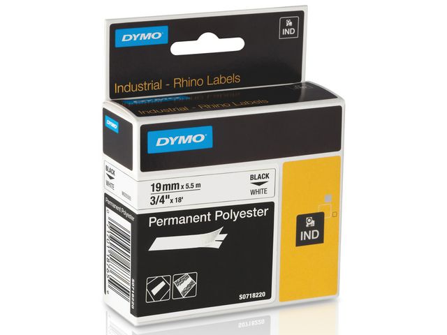 Den permanente DYMO® Rhino-polyesterkassetten på 19 mm inneholder kraftig polyesterteip i sort og hvitt. Gir robuste etiketter som varer lenge. Perfekt til bruk innendørs og utendørs for merking av beholdere, paneler, bjelker eller hyller. Rhino-etikettene viser tekst som skrives ut ved hjelp av varmeoverføringsteknologi, noe som fjerner behovet for blekk og toner. De er bestandige mot vann, UV-lys, kjemikalier og olje og har en sterk klebeevne som passer utmerket for industriell bruk. De er temperaturbestandige mellom -40 og 150 grader Celsius. Bare ta av baksiden av etiketten for enkel påføring.